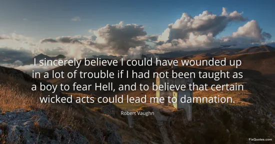Vaughn, Robert. "I sincerely believe I could have wounded up in a lot of trouble if I had not been taught as a boy to fear Hell, and to believe that certain wicked acts could lead me to damnation." FixQuotes. January 17, 2026. https://fixquotes.com/quotes/i-sincerely-believe-i-could-have-wounded-up-in-a-71357/.
