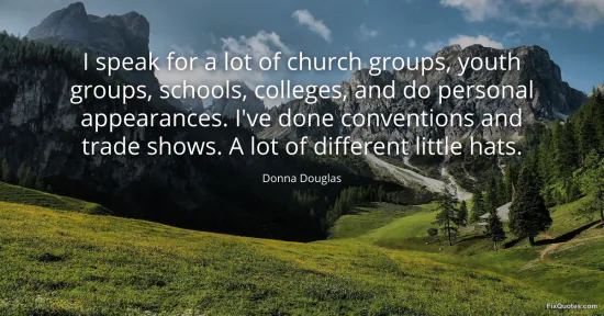 Douglas, Donna. "I speak for a lot of church groups, youth groups, schools, colleges, and do personal appearances. I've done conventions and trade shows. A lot of different little hats." FixQuotes. February 16, 2026. https://fixquotes.com/quotes/i-speak-for-a-lot-of-church-groups-youth-groups-117268/.