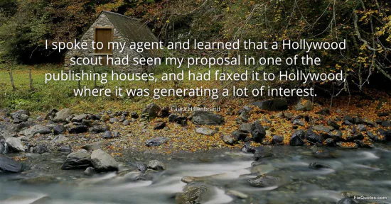 Hillenbrand, Laura. "I spoke to my agent and learned that a Hollywood scout had seen my proposal in one of the publishing houses, and had faxed it to Hollywood, where it was generating a lot of interest." FixQuotes. January 15, 2026. https://fixquotes.com/quotes/i-spoke-to-my-agent-and-learned-that-a-hollywood-155271/.