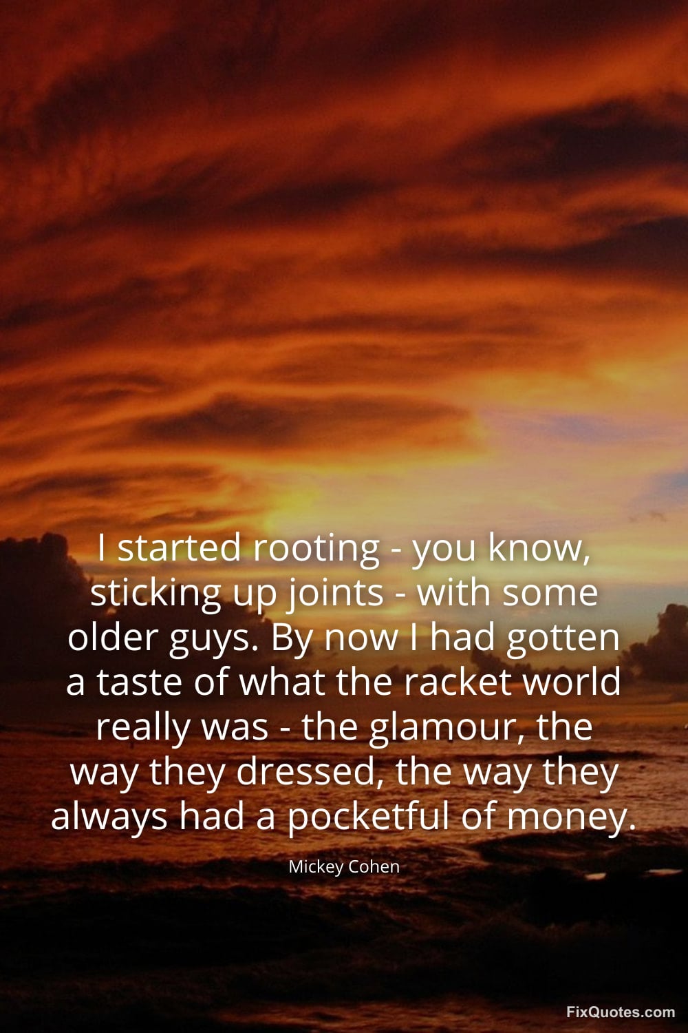 Cohen, Mickey. (2026, January 16). I started rooting - you know, sticking up joints - with some older guys. By now I had gotten a taste of what the racket world really was - the glamour, the way they dressed, the way they always had a pocketful of money. FixQuotes. https://fixquotes.com/quotes/i-started-rooting-you-know-sticking-up-joints-136722/