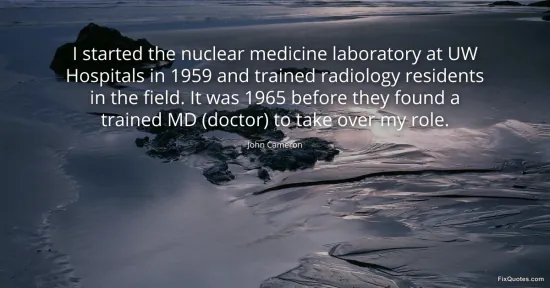 Cameron, John. "I started the nuclear medicine laboratory at UW Hospitals in 1959 and trained radiology residents in the field. It was 1965 before they found a trained MD (doctor) to take over my role." FixQuotes. January 17, 2026. https://fixquotes.com/quotes/i-started-the-nuclear-medicine-laboratory-at-uw-64387/.