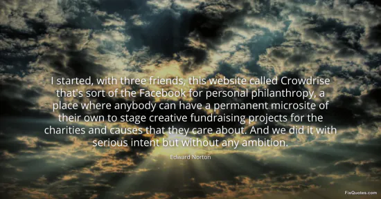 Norton, Edward. "I started, with three friends, this website called Crowdrise that's sort of the Facebook for personal philanthropy, a place where anybody can have a permanent microsite of their own to stage creative fundraising projects for the charities and causes that they care about. And we did it with serious intent but without any ambition." FixQuotes. Accessed February 3, 2026. https://fixquotes.com/quotes/i-started-with-three-friends-this-website-called-184333/.