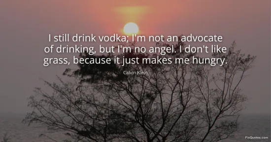 Klein, Calvin. (2026, January 17). I still drink vodka; I'm not an advocate of drinking, but I'm no angel. I don't like grass, because it just makes me hungry. FixQuotes. https://fixquotes.com/quotes/i-still-drink-vodka-im-not-an-advocate-of-24410/