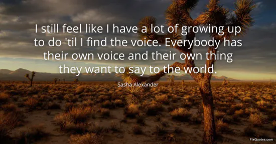 Alexander, Sasha. "I still feel like I have a lot of growing up to do 'til I find the voice. Everybody has their own voice and their own thing they want to say to the world." FixQuotes. January 16, 2026. https://fixquotes.com/quotes/i-still-feel-like-i-have-a-lot-of-growing-up-to-102208/.