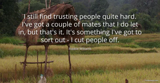 Williams, Robbie. "I still find trusting people quite hard. I've got a couple of mates that I do let in, but that's it. It's something I've got to sort out - I cut people off." FixQuotes. January 16, 2026. https://fixquotes.com/quotes/i-still-find-trusting-people-quite-hard-ive-got-a-94698/.