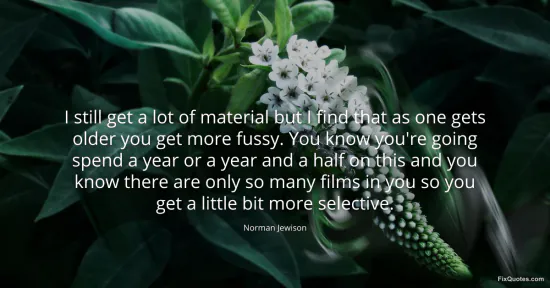 Jewison, Norman. (2026, January 14). I still get a lot of material but I find that as one gets older you get more fussy. You know you're going spend a year or a year and a half on this and you know there are only so many films in you so you get a little bit more selective. FixQuotes. https://fixquotes.com/quotes/i-still-get-a-lot-of-material-but-i-find-that-as-165570/
