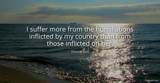 Weil, Simone. (2026, January 17). I suffer more from the humiliations inflicted by my country than from those inflicted on her. FixQuotes. https://fixquotes.com/quotes/i-suffer-more-from-the-humiliations-inflicted-by-24160/