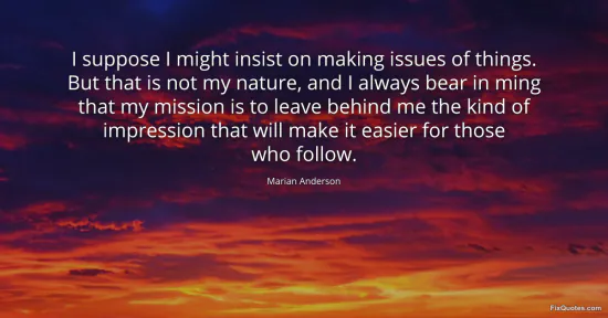 Anderson, Marian. (2026, January 16). I suppose I might insist on making issues of things. But that is not my nature, and I always bear in ming that my mission is to leave behind me the kind of impression that will make it easier for those who follow. FixQuotes. https://fixquotes.com/quotes/i-suppose-i-might-insist-on-making-issues-of-93122/