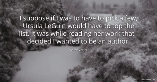 Zettel, Sarah. "I suppose if I was to have to pick a few, Ursula LeGuin would have to top the list. It was while reading her work that I decided I wanted to be an author." FixQuotes. January 16, 2026. https://fixquotes.com/quotes/i-suppose-if-i-was-to-have-to-pick-a-few-ursula-86203/.