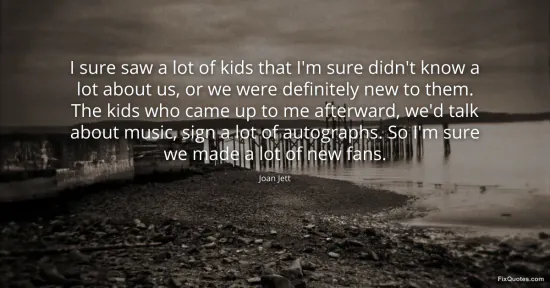 Jett, Joan. "I sure saw a lot of kids that I'm sure didn't know a lot about us, or we were definitely new to them. The kids who came up to me afterward, we'd talk about music, sign a lot of autographs. So I'm sure we made a lot of new fans." FixQuotes. January 16, 2026. https://fixquotes.com/quotes/i-sure-saw-a-lot-of-kids-that-im-sure-didnt-know-89838/.