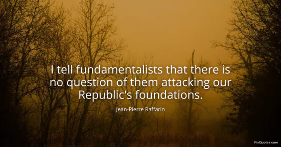Raffarin, Jean-Pierre. "I tell fundamentalists that there is no question of them attacking our Republic's foundations." FixQuotes. January 16, 2026. https://fixquotes.com/quotes/i-tell-fundamentalists-that-there-is-no-question-112779/.