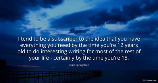 Springsteen, Bruce. (2026, January 17). I tend to be a subscriber to the idea that you have everything you need by the time you're 12 years old to do interesting writing for most of the rest of your life - certainly by the time you're 18. FixQuotes. https://fixquotes.com/quotes/i-tend-to-be-a-subscriber-to-the-idea-that-you-40336/