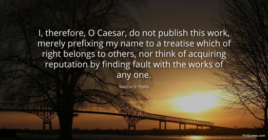 Pollio, Marcus V. "I, therefore, O Caesar, do not publish this work, merely prefixing my name to a treatise which of right belongs to others, nor think of acquiring reputation by finding fault with the works of any one." FixQuotes. January 16, 2026. https://fixquotes.com/quotes/i-therefore-o-caesar-do-not-publish-this-work-102338/.