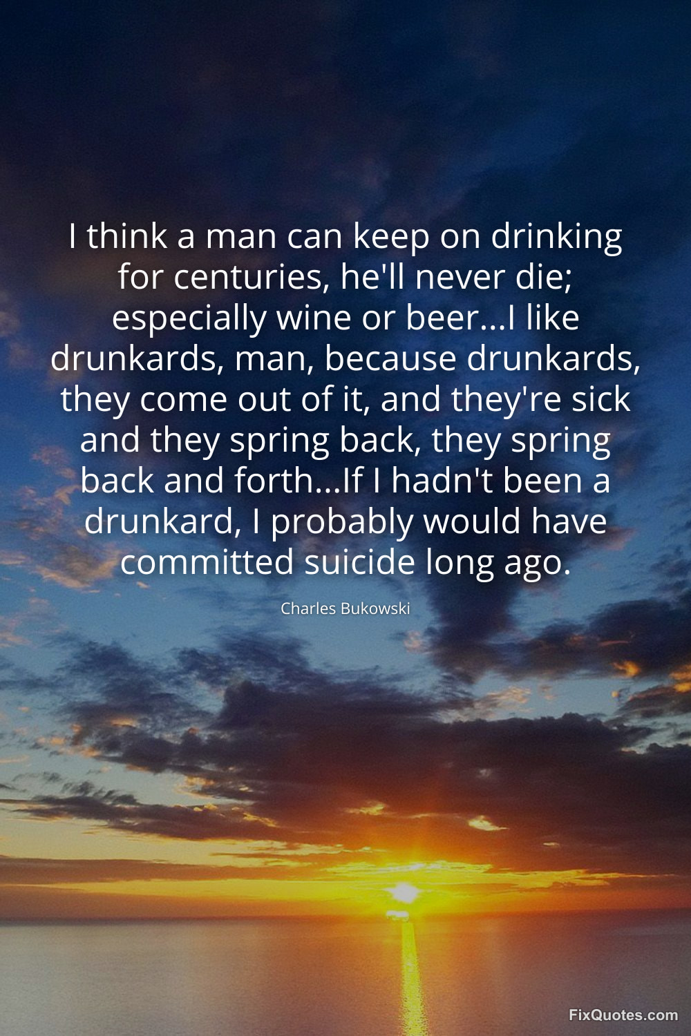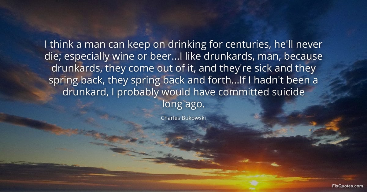 Bukowski, Charles. (2026, February 10). I think a man can keep on drinking for centuries, he'll never die; especially wine or beer...I like drunkards, man, because drunkards, they come out of it, and they're sick and they spring back, they spring back and forth...If I hadn't been a drunkard, I probably would have committed suicide long ago. FixQuotes. https://fixquotes.com/quotes/i-think-a-man-can-keep-on-drinking-for-centuries-185177/