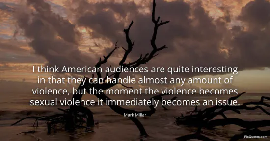 Millar, Mark. "I think American audiences are quite interesting in that they can handle almost any amount of violence, but the moment the violence becomes sexual violence it immediately becomes an issue." FixQuotes. January 18, 2026. https://fixquotes.com/quotes/i-think-american-audiences-are-quite-interesting-20884/.