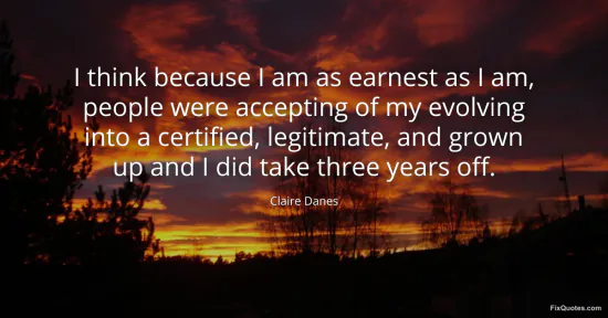 Danes, Claire. "I think because I am as earnest as I am, people were accepting of my evolving into a certified, legitimate, and grown up and I did take three years off." FixQuotes. January 17, 2026. https://fixquotes.com/quotes/i-think-because-i-am-as-earnest-as-i-am-people-49992/.