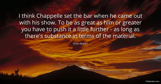 Spears, Aries. (2026, January 15). I think Chappelle set the bar when he came out with his show. To be as great as him or greater you have to push it a little further - as long as there's substance in terms of the material. FixQuotes. https://fixquotes.com/quotes/i-think-chappelle-set-the-bar-when-he-came-out-161039/