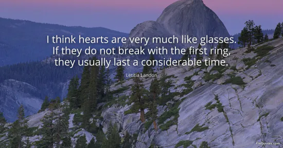 Landon, Letitia. "I think hearts are very much like glasses. If they do not break with the first ring, they usually last a considerable time." FixQuotes. January 16, 2026. https://fixquotes.com/quotes/i-think-hearts-are-very-much-like-glasses-if-they-87600/.