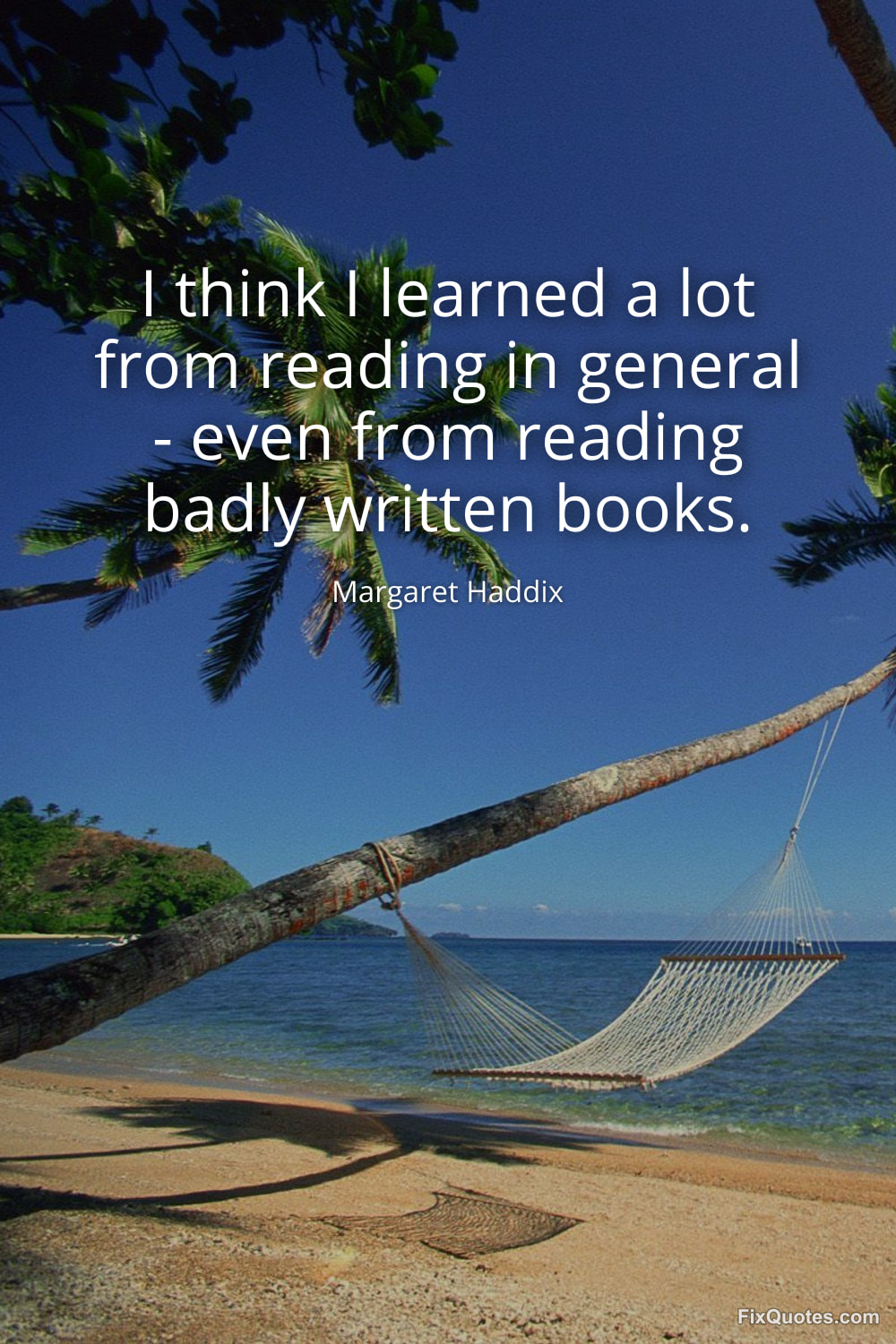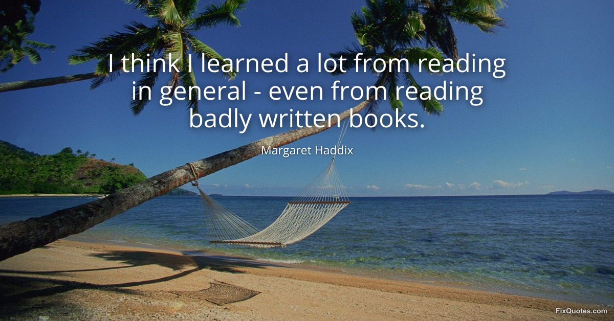 Haddix, Margaret. (2026, January 16). I think I learned a lot from reading in general - even from reading badly written books. FixQuotes. https://fixquotes.com/quotes/i-think-i-learned-a-lot-from-reading-in-general-127705/