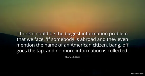 Bass, Charles F. "I think it could be the biggest information problem that we face. 'If somebody is abroad and they even mention the name of an American citizen, bang, off goes the tap, and no more information is collected." FixQuotes. January 16, 2026. https://fixquotes.com/quotes/i-think-it-could-be-the-biggest-information-99348/.