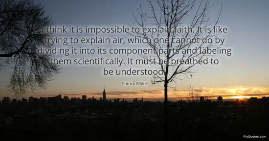 White, Patrick. (2026, January 16). I think it is impossible to explain faith. It is like trying to explain air, which one cannot do by dividing it into its component parts and labeling them scientifically. It must be breathed to be understood. FixQuotes. https://fixquotes.com/quotes/i-think-it-is-impossible-to-explain-faith-it-is-115636/