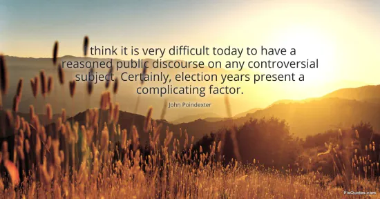 Poindexter, John. "I think it is very difficult today to have a reasoned public discourse on any controversial subject. Certainly, election years present a complicating factor." FixQuotes. January 16, 2026. https://fixquotes.com/quotes/i-think-it-is-very-difficult-today-to-have-a-114280/.