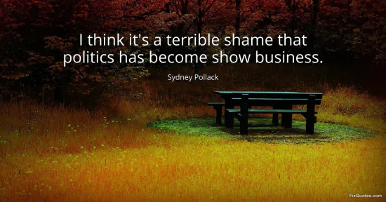 Pollack, Sydney. (2026, January 16). I think it's a terrible shame that politics has become show business. FixQuotes. https://fixquotes.com/quotes/i-think-its-a-terrible-shame-that-politics-has-110340/