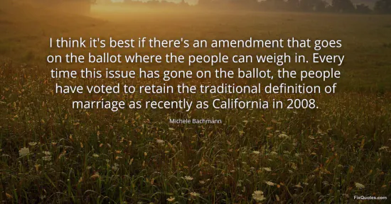 Bachmann, Michele. (2026, January 17). I think it's best if there's an amendment that goes on the ballot where the people can weigh in. Every time this issue has gone on the ballot, the people have voted to retain the traditional definition of marriage as recently as California in 2008. FixQuotes. https://fixquotes.com/quotes/i-think-its-best-if-theres-an-amendment-that-goes-72958/