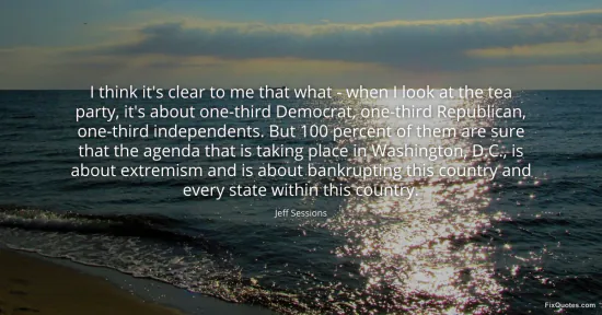 Sessions, Jeff. "I think it's clear to me that what - when I look at the tea party, it's about one-third Democrat, one-third Republican, one-third independents. But 100 percent of them are sure that the agenda that is taking place in Washington, D.C., is about extremism and is about bankrupting this country and every state within this country." FixQuotes. January 17, 2026. https://fixquotes.com/quotes/i-think-its-clear-to-me-that-what-when-i-look-75991/.