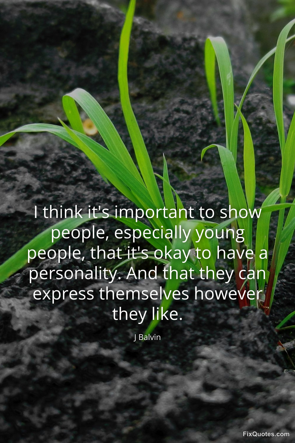 Balvin, J. "I think it's important to show people, especially young people, that it's okay to have a personality. And that they can express themselves however they like." FixQuotes. February 4, 2026. https://fixquotes.com/quotes/i-think-its-important-to-show-people-especially-184898/.