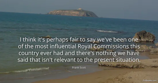 Scott, Frank. "I think it's perhaps fair to say we've been one of the most influential Royal Commissions this country ever had and there's nothing we have said that isn't relevant to the present situation." FixQuotes. January 16, 2026. https://fixquotes.com/quotes/i-think-its-perhaps-fair-to-say-weve-been-one-of-130726/.