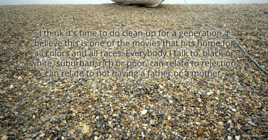 "I think it's time to do clean-up for a generation. I believe this is one of the movies that hits home for all colors and all races. Everybody I talk to, black or white, suburban, rich or poor, can relate to rejection, can relate to not having a father or a mother." FixQuotes, 17 Jan. 2026, https://fixquotes.com/quotes/i-think-its-time-to-do-clean-up-for-a-generation-52564/. Accessed 12 Feb. 2026.