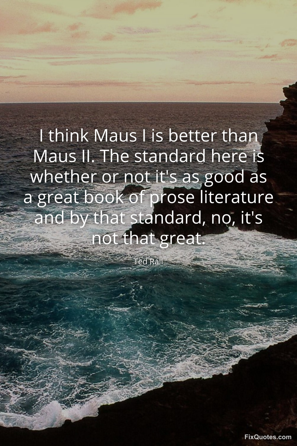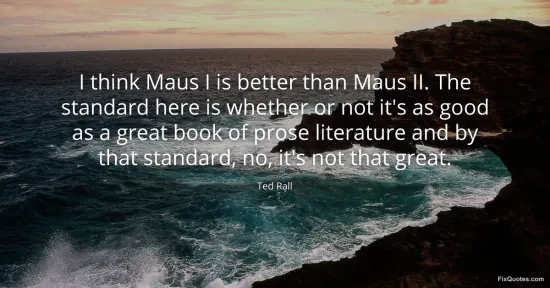 Rall, Ted. (2026, January 15). I think Maus I is better than Maus II. The standard here is whether or not it's as good as a great book of prose literature and by that standard, no, it's not that great. FixQuotes. https://fixquotes.com/quotes/i-think-maus-i-is-better-than-maus-ii-the-165891/