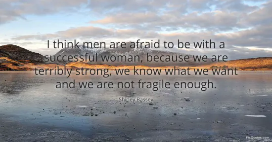 The word choice matters. “Afraid” is blunt and a little taunting, a refusal to psychoanalyze men into sympathy. “Terribly strong” carries a theatrical charge, like a spotlight flare - Bassey’s signature - making strength sound both admirable and socially disruptive. And “not fragile enough” is the sharpest twist: she’s naming how femininity has been historically rewarded when it appears delicate, manageable, grateful. Fragility becomes a kind of social currency; lacking it reads, in her telling, as a threat.