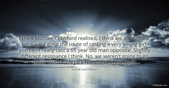Webber, Andrew Lloyd. (2026, January 15). I think Michael Crawford realised, I think we all realised, once we'd gone the route of casting a very young girl, you can't really cast a 65 year old man opposite. Slightly different resonance I think. No, we weren't going to go there. We'd have Jack Nicholson in the lead. FixQuotes. https://fixquotes.com/quotes/i-think-michael-crawford-realised-i-think-we-all-160937/