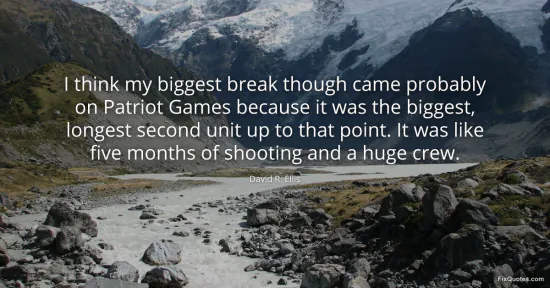 Ellis, David R. "I think my biggest break though came probably on Patriot Games because it was the biggest, longest second unit up to that point. It was like five months of shooting and a huge crew." FixQuotes. January 17, 2026. https://fixquotes.com/quotes/i-think-my-biggest-break-though-came-probably-on-56630/.