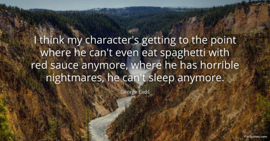 Eads, George. (2026, January 15). I think my character's getting to the point where he can't even eat spaghetti with red sauce anymore, where he has horrible nightmares, he can't sleep anymore. FixQuotes. https://fixquotes.com/quotes/i-think-my-characters-getting-to-the-point-where-146464/
