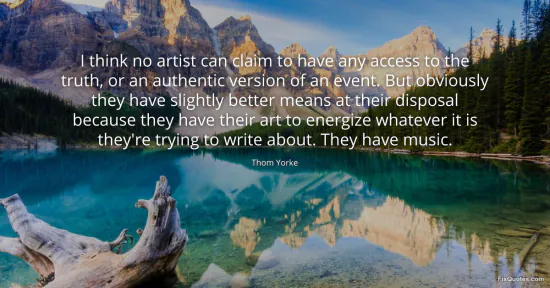 Yorke, Thom. (2026, January 15). I think no artist can claim to have any access to the truth, or an authentic version of an event. But obviously they have slightly better means at their disposal because they have their art to energize whatever it is they're trying to write about. They have music. FixQuotes. https://fixquotes.com/quotes/i-think-no-artist-can-claim-to-have-any-access-to-25996/