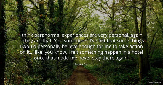 Corr, Andrea. "I think paranormal experiences are very personal, again, if they are that. Yes, sometimes I've felt that some things I would personally believe enough for me to take action on it... like, you know, I felt something happen in a hotel once that made me never stay there again." FixQuotes. January 16, 2026. https://fixquotes.com/quotes/i-think-paranormal-experiences-are-very-personal-100654/.
