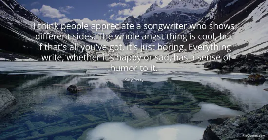 Perry, Katy. "I think people appreciate a songwriter who shows different sides. The whole angst thing is cool, but if that's all you've got, it's just boring. Everything I write, whether it's happy or sad, has a sense of humor to it." FixQuotes. January 15, 2026. https://fixquotes.com/quotes/i-think-people-appreciate-a-songwriter-who-shows-150569/.