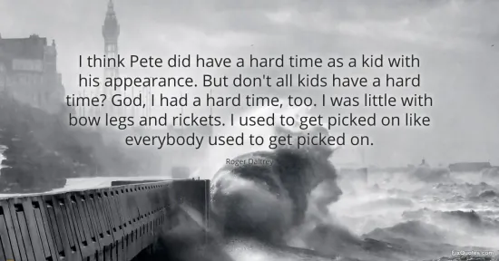 Daltrey, Roger. "I think Pete did have a hard time as a kid with his appearance. But don't all kids have a hard time? God, I had a hard time, too. I was little with bow legs and rickets. I used to get picked on like everybody used to get picked on." FixQuotes. January 16, 2026. https://fixquotes.com/quotes/i-think-pete-did-have-a-hard-time-as-a-kid-with-98471/.
