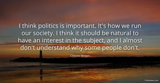 Brown, Chester. (2026, January 17). I think politics is important. It's how we run our society. I think it should be natural to have an interest in the subject, and I almost don't understand why some people don't. FixQuotes. https://fixquotes.com/quotes/i-think-politics-is-important-its-how-we-run-our-44382/