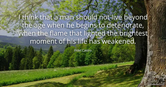 Castro, Fidel. (2026, January 17). I think that a man should not live beyond the age when he begins to deteriorate, when the flame that lighted the brightest moment of his life has weakened. FixQuotes. https://fixquotes.com/quotes/i-think-that-a-man-should-not-live-beyond-the-age-31139/