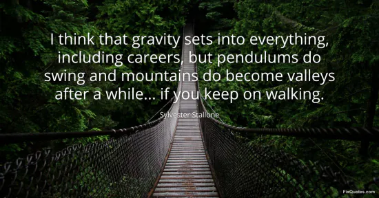 Stallone, Sylvester. "I think that gravity sets into everything, including careers, but pendulums do swing and mountains do become valleys after a while... if you keep on walking." FixQuotes. January 17, 2026. https://fixquotes.com/quotes/i-think-that-gravity-sets-into-everything-78451/.
