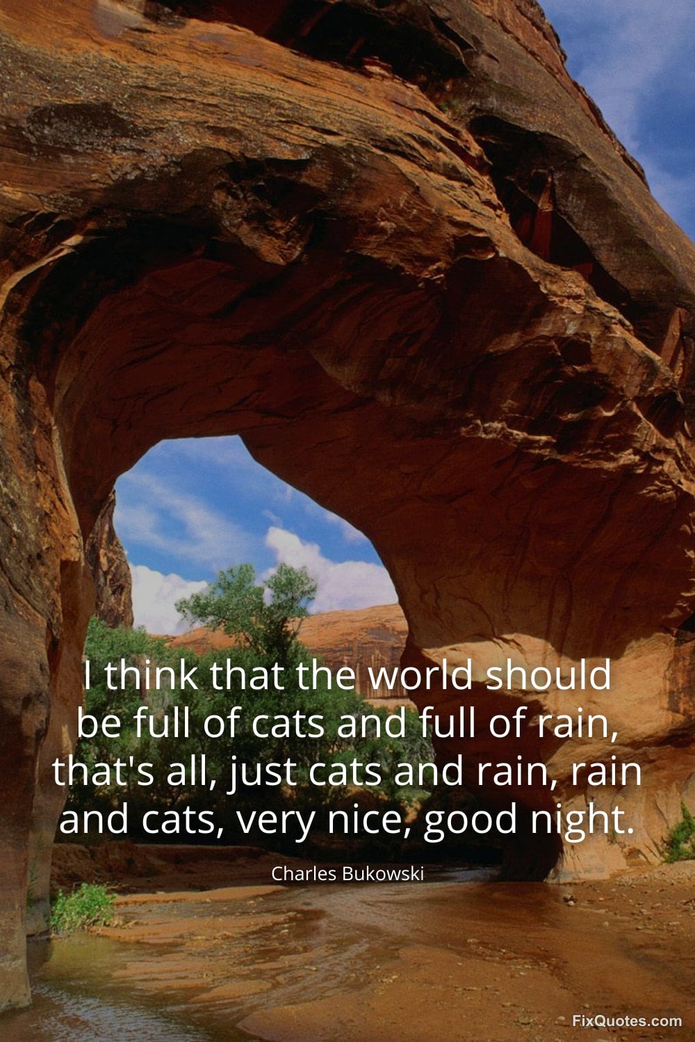 Bukowski, Charles. "I think that the world should be full of cats and full of rain, that's all, just cats and rain, rain and cats, very nice, good night." FixQuotes. February 10, 2026. https://fixquotes.com/quotes/i-think-that-the-world-should-be-full-of-cats-and-185143/.
