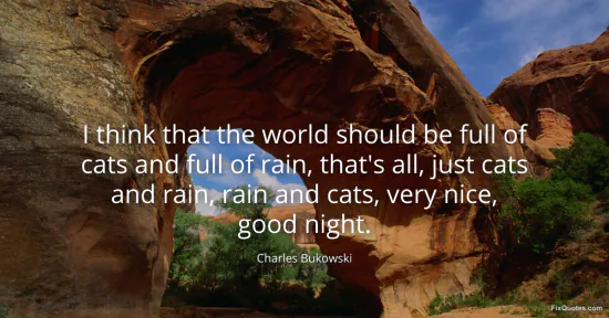 Bukowski, Charles. (2026, February 10). I think that the world should be full of cats and full of rain, that's all, just cats and rain, rain and cats, very nice, good night. FixQuotes. https://fixquotes.com/quotes/i-think-that-the-world-should-be-full-of-cats-and-185143/