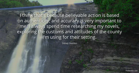 Sheldon, Sidney. "I think that's because believable action is based on authenticity, and accuracy is very important to me. I always spend time researching my novels, exploring the customs and attitudes of the county I'm using for their setting." FixQuotes. January 16, 2026. https://fixquotes.com/quotes/i-think-thats-because-believable-action-is-based-116721/.