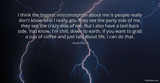 Polizzi, Nicole. "I think the biggest misconception about me is people really don't know who I really am. They see the party side of me, they see the crazy side of me. But I also have a laid-back side. You know, I'm chill, down to earth. If you want to grab a cup of coffee and just talk about life, I can do that." FixQuotes. January 18, 2026. https://fixquotes.com/quotes/i-think-the-biggest-misconception-about-me-is-20789/.