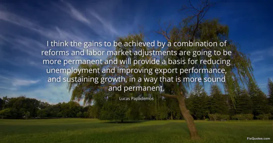Papademos, Lucas. "I think the gains to be achieved by a combination of reforms and labor market adjustments are going to be more permanent and will provide a basis for reducing unemployment and improving export performance, and sustaining growth, in a way that is more sound and permanent." FixQuotes. Accessed February 2, 2026. https://fixquotes.com/quotes/i-think-the-gains-to-be-achieved-by-a-combination-161322/.