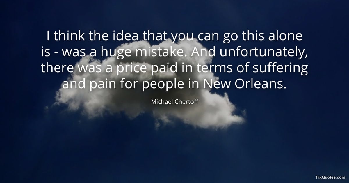 Chertoff, Michael. (2026, January 15). I think the idea that you can go this alone is - was a huge mistake. And unfortunately, there was a price paid in terms of suffering and pain for people in New Orleans. FixQuotes. https://fixquotes.com/quotes/i-think-the-idea-that-you-can-go-this-alone-is-153849/